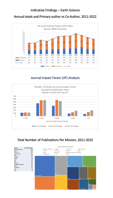Analysis factors include the number of publications that cite data from JPL missions, the number of publications authored by JPL as either first or contributing author, changes in publication data over time, and other developments to add more fidelity to these questions to reveal and analyze trends. The charts included here represent indicative findings from the initial Earth Science publication analysis.